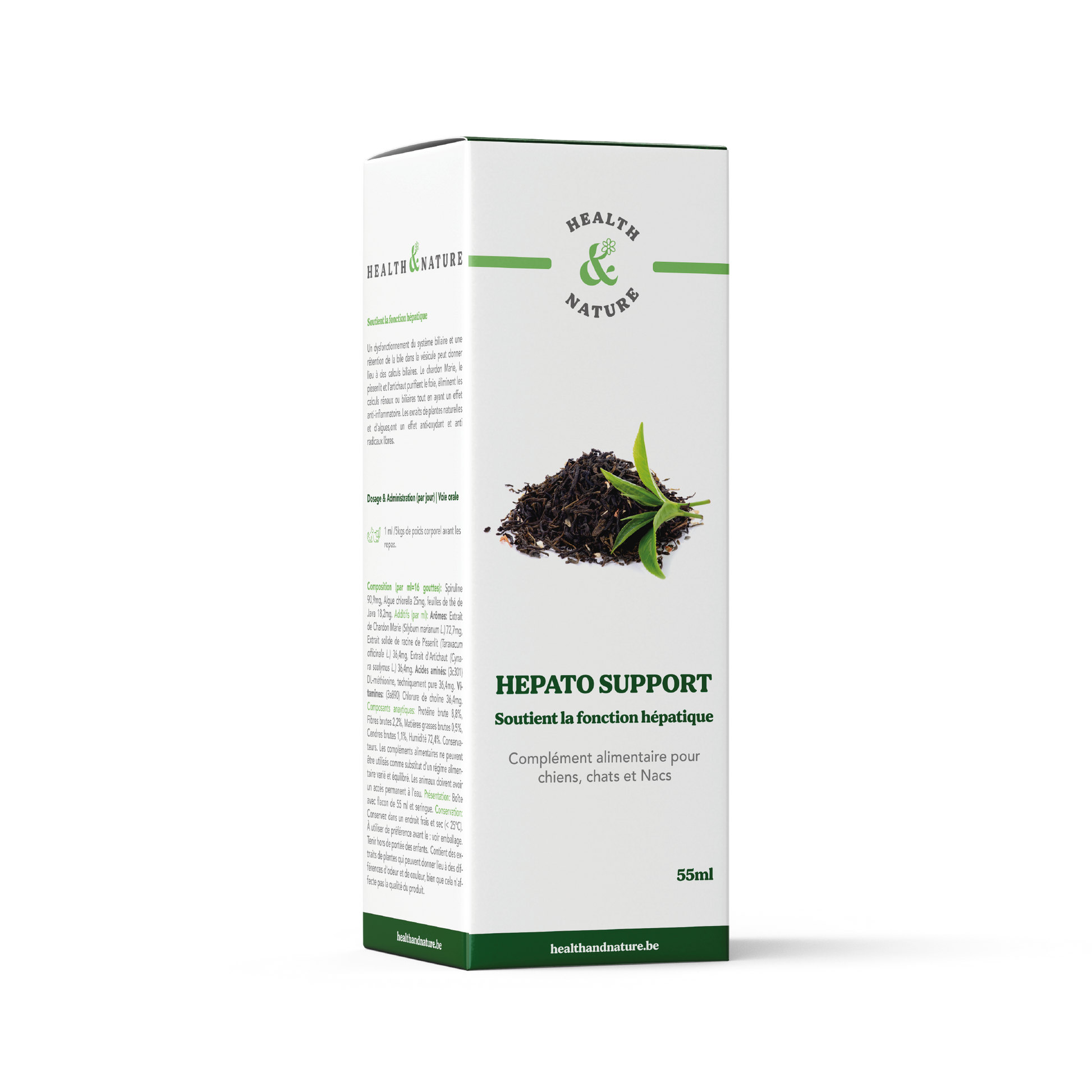 Spiruline (90,9 mg), algues chlorella (25 mg), feuilles d'orthosiphon (18,2 mg). Additifs (par ml) : Arômes: Extrait de Chardon Marie (Silybum marianum L.) 72,7mg, Extrait solide de racine de Pissenlit (Taraxacum officinale L.) 36,4mg, Extrait d'Artichaut (Cynara scolymus L.) 36,4mg. Acides aminés: (3c301) DL-méthionine, techniquement pure 36,4mg. Vitamines: (3a890) Chlorure de choline 36,4mg.
